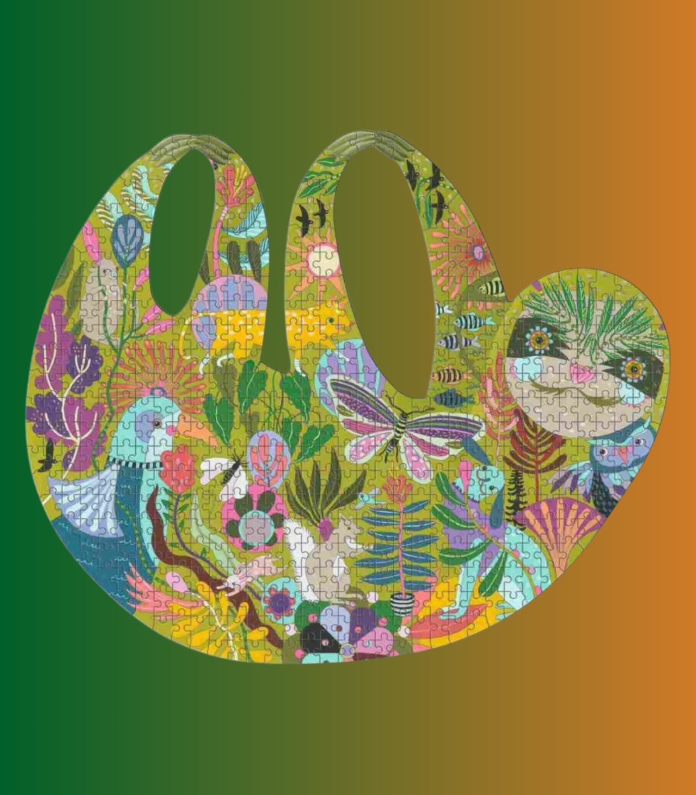 Dieses außergewöhnliche Puzzle von DJECO wirft die klassische Puzzleform über den Haufen: Kein Rahmen, keine Ecken – dafür eine durchbrochene Faultier-Silhouette, die eine zauberhafte, detailreiche Fantasiewelt verbirgt.